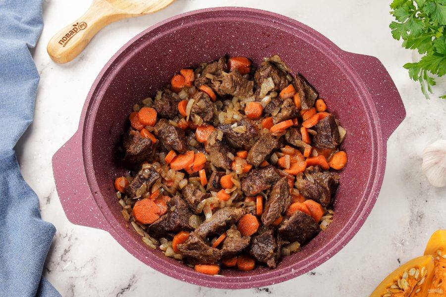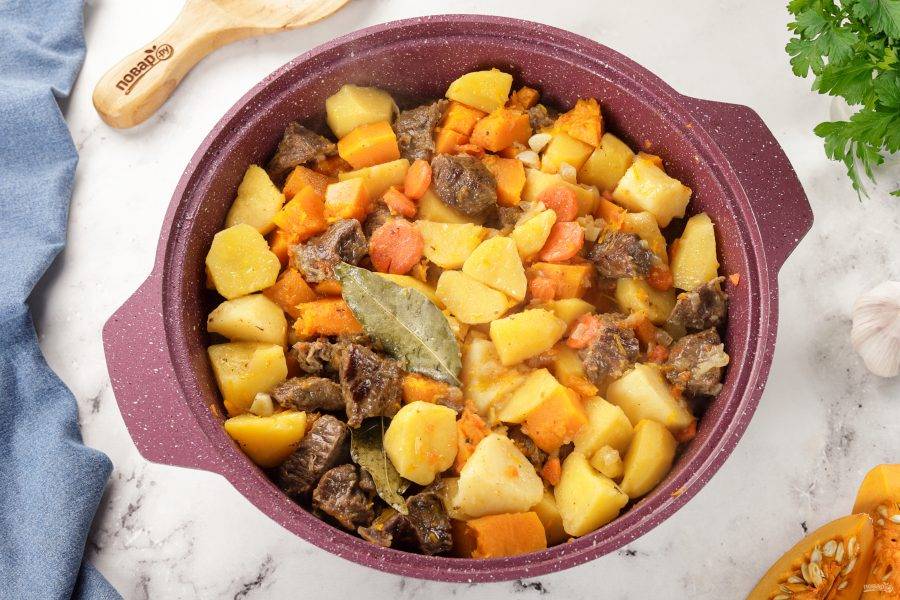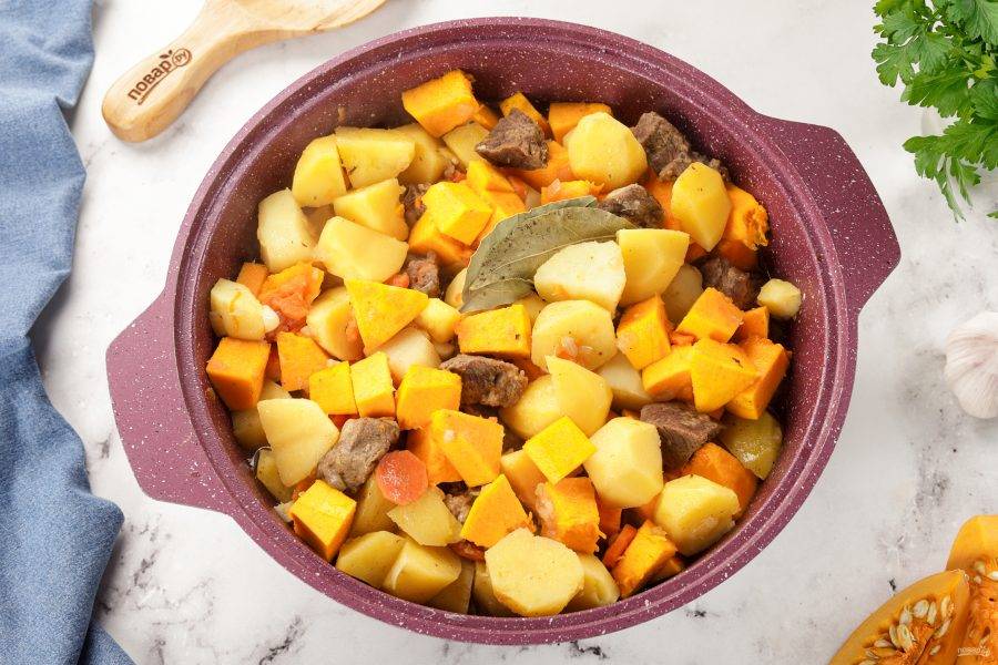 Тушите под крышкой 5-10 минут. Если жаркое получается суховатым, то можно долить ещё немного воды, так же следите за тем, чтобы тыква не разварилась и сохранила форму.