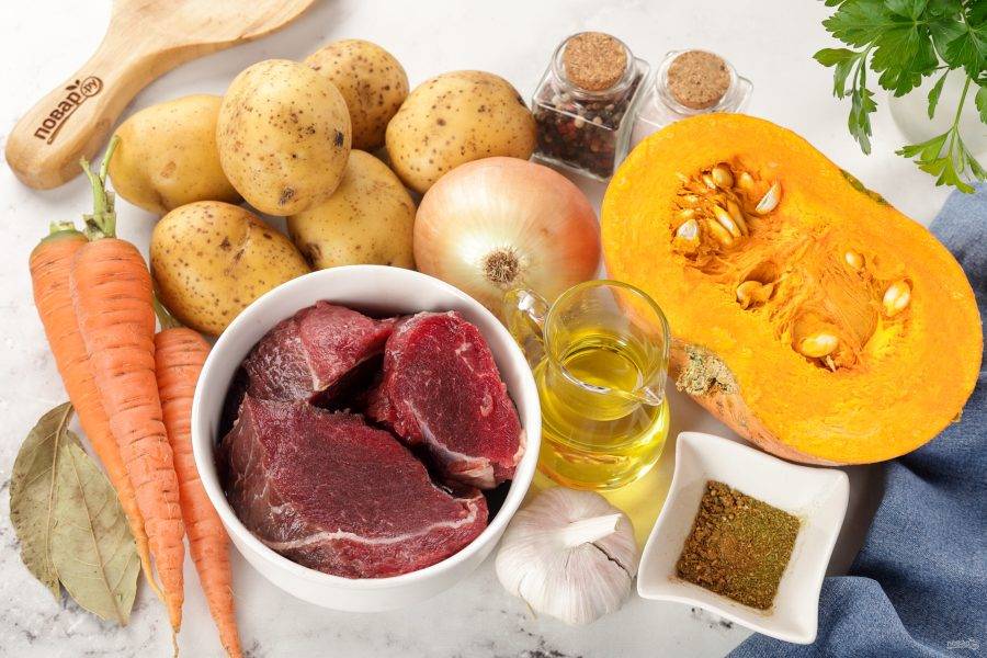 Подготовьте все ингредиенты по списку. Я буду готовить жаркое с говядиной, но вы можете взять любое другое мясо на свой вкус.