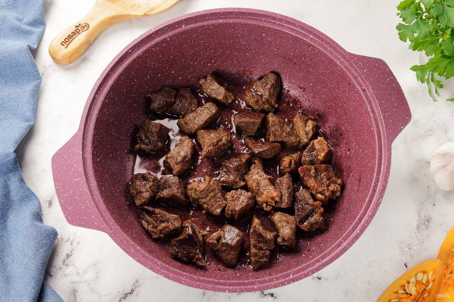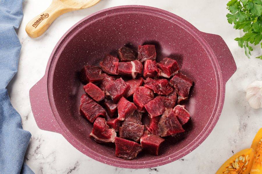 Говядину промойте, обсушите и нарежьте кусочками. В глубокой толстостенной посуде разогрейте масло и выложите нарезанное мясо.