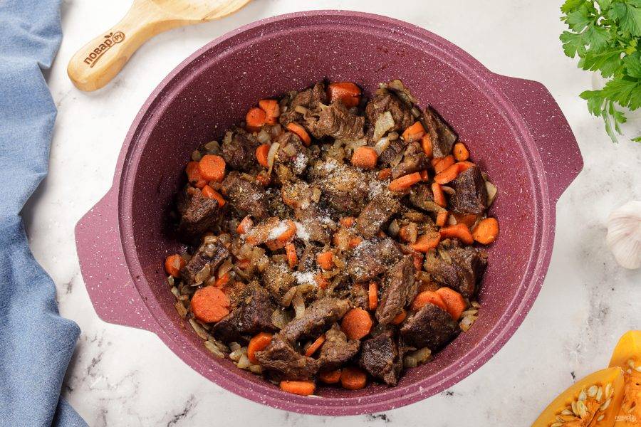 Добавьте соль и специи, готовьте помешивая, ещё 2-3 минуты.