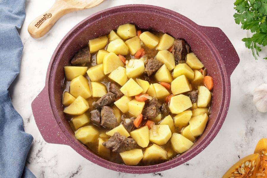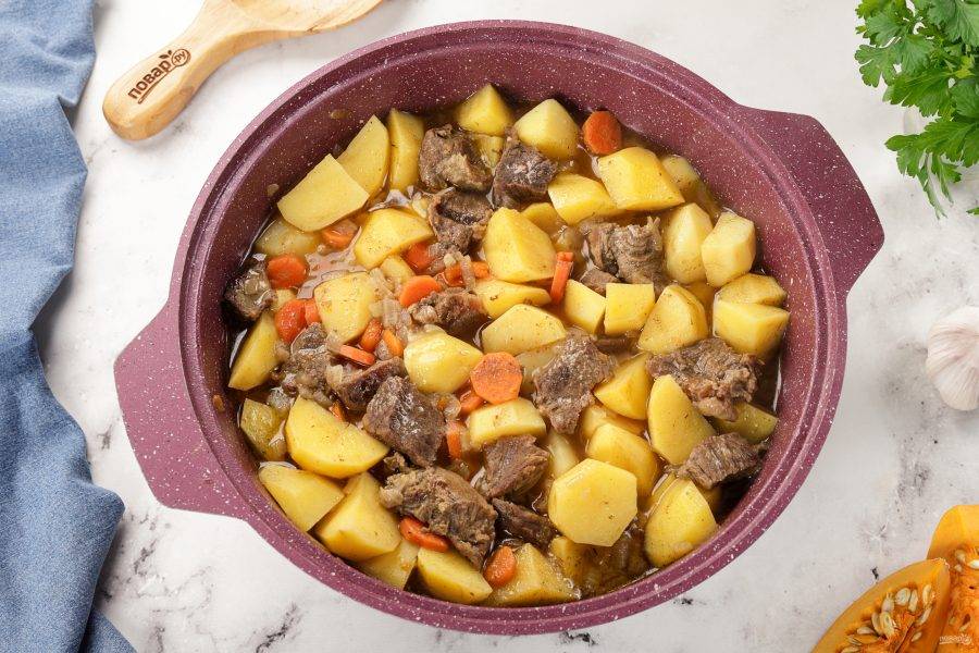 Тушите на небольшом огне 10-15 минут, до полуготовности картофеля.