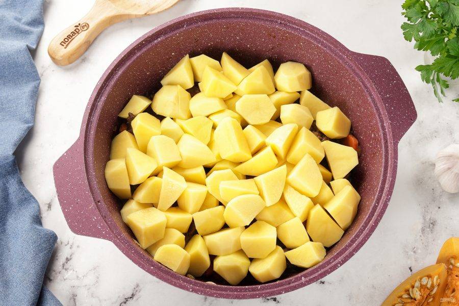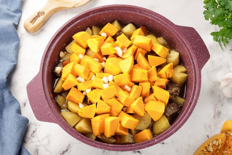 Затем добавьте нарезанную крупными кусочками тыкву и нарезанный кубиками чеснок.