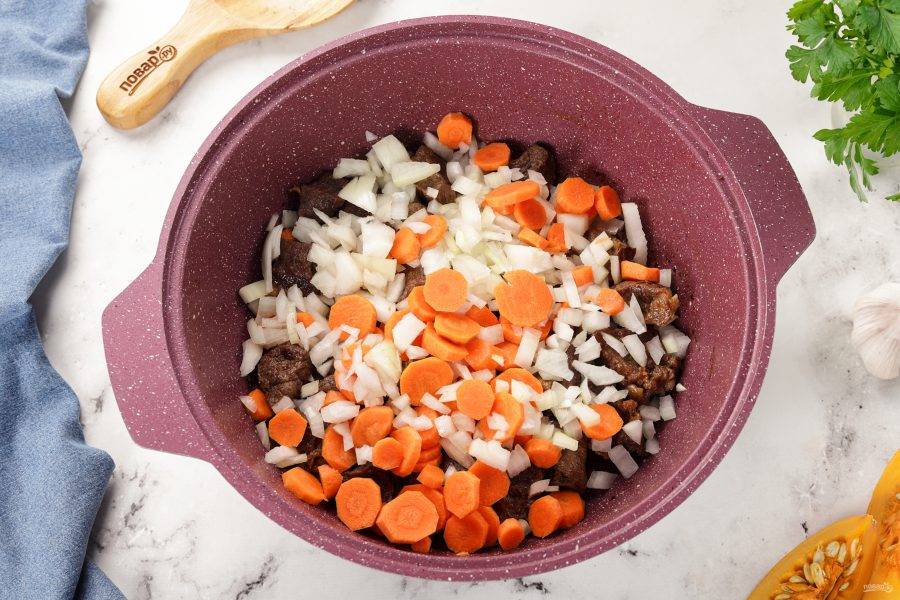 Затем добавьте нарезанные лук и морковь, нарезка может быть любая — как вам больше нравится.