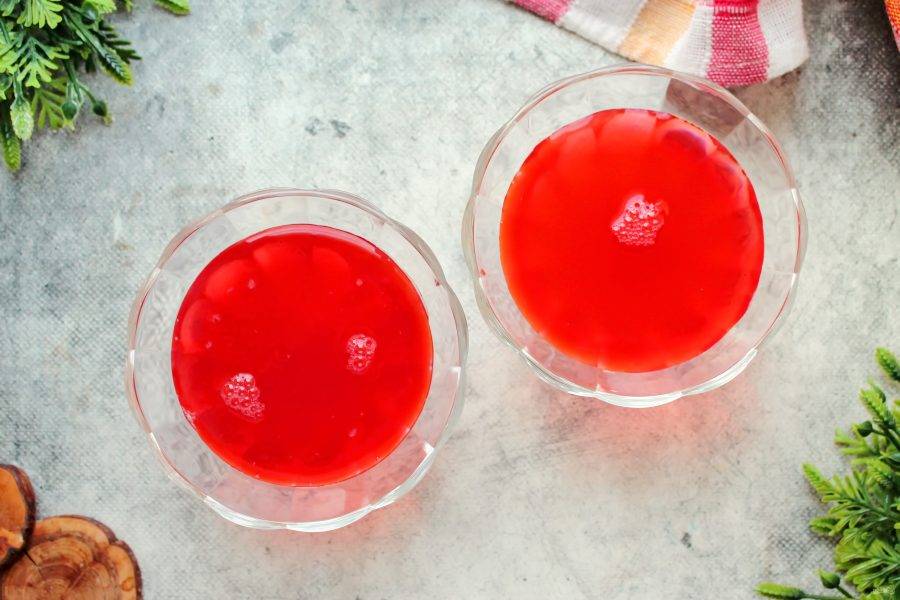 Распустите желатин и сахар любым удобным способом. Разлейте желейную смесь в креманки или бокалы и поставьте в холодное место, примерно на 15-20 минут, чтобы слой схватился и стал плотнее.