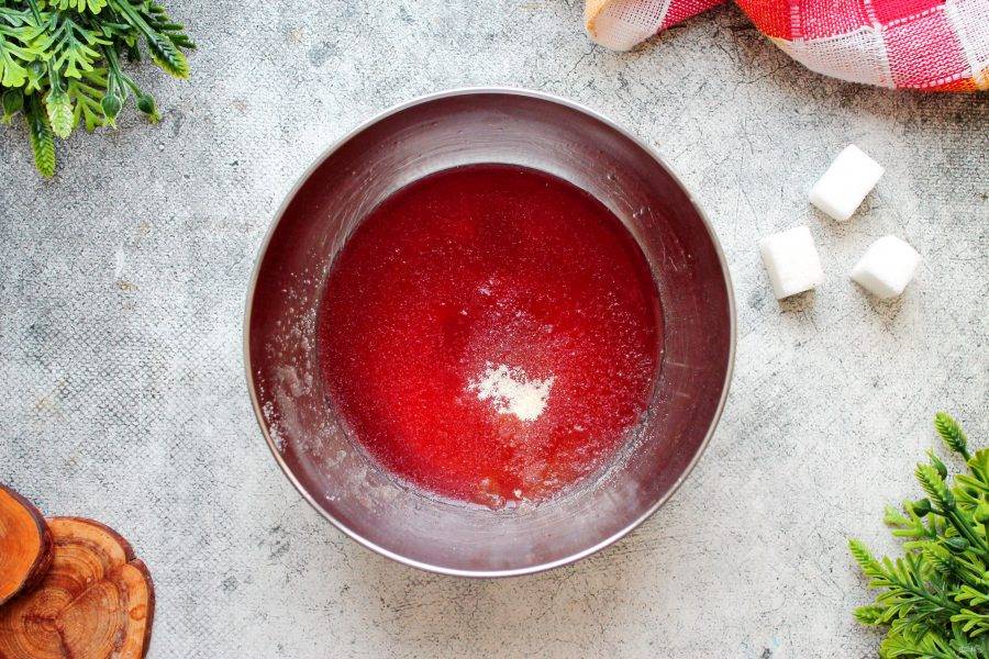 Пока первый слой застывает, сразу делайте второй. Для этого налейте ягодный сок, у меня лесные ягоды, в миску и всыпьте желатин и сахар. Если вашему желатину нужно время для набухания, соединяйте все вида сока с желатином одновременно.
