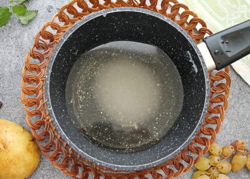 Оставшийся сок вылейте в сотейник и добавьте половину сахара. Поставьте на средний огонь и прогрейте до растворения сахара. Не кипятите! Снимите сок с огня и выложите половину набухшего желатина. Перемешайте до полного растворения и остудите.
