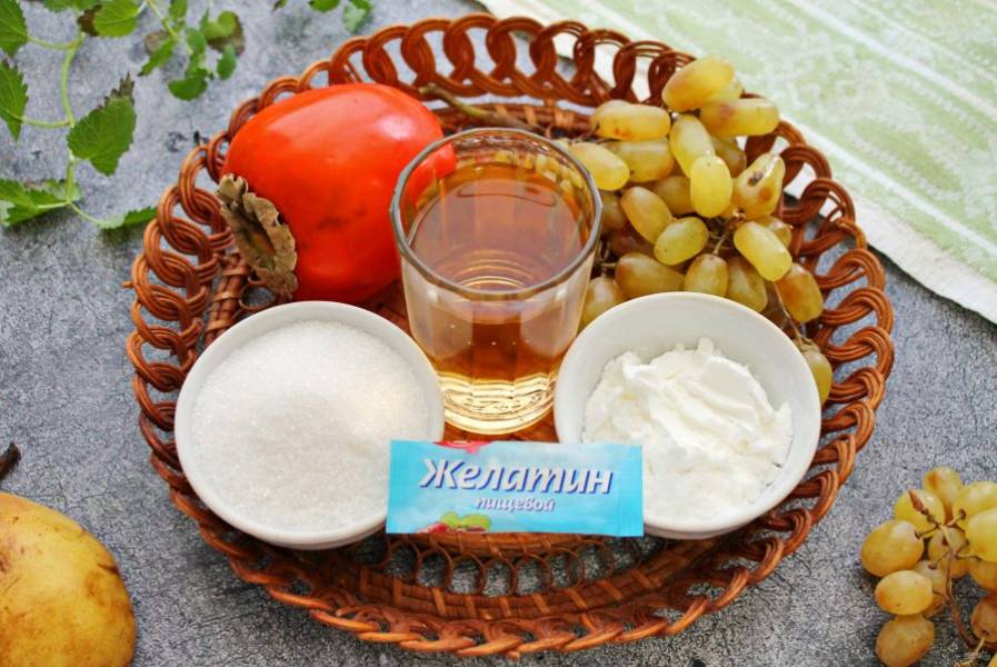 Подготовьте все необходимые ингредиенты для приготовления королевского желе. Хурму и виноград тщательно вымойте и обсушите.