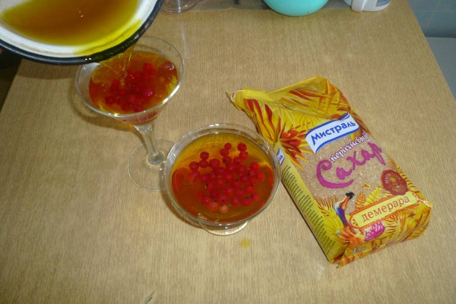 Снимаем кастрюлю с огня, и разливаем содержимое по креманкам. Остужаем на 1,5 часа до схватывания желе.