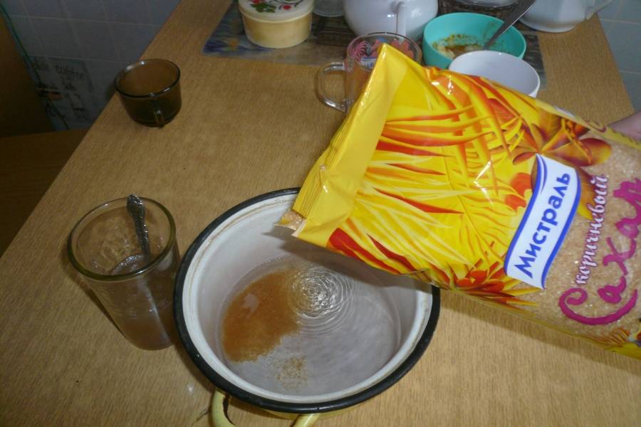 В 350 мл воды растворяем 100 грамм сахара "Мистраль" тропического нерафинированного коричневого
