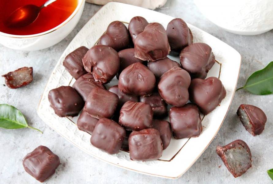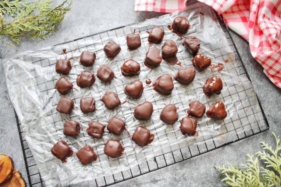 Шоколад растопите на водяной бане, остудите и окуните каждую желейную часть. Разложите на пленку на расстоянии и дайте полностью застыть шоколаду.