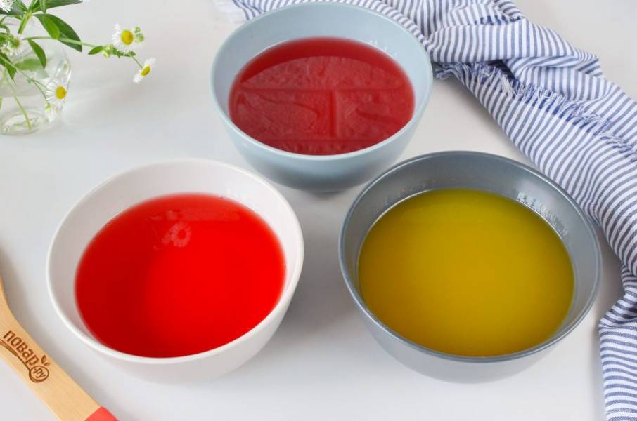 Первым делом нужно сделать цветное желе. Вскипятите 900 мл. воды, залейте каждое желе 300 мл. воды, перемешайте и охладите в холодильнике до полного крепкого застывания (примерно 2 часа). Если на пакетике написано добавить 400 мл. воды — добавьте 300 мл., чтобы желе было плотным.