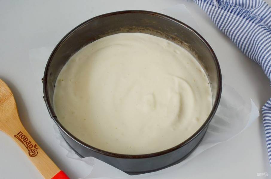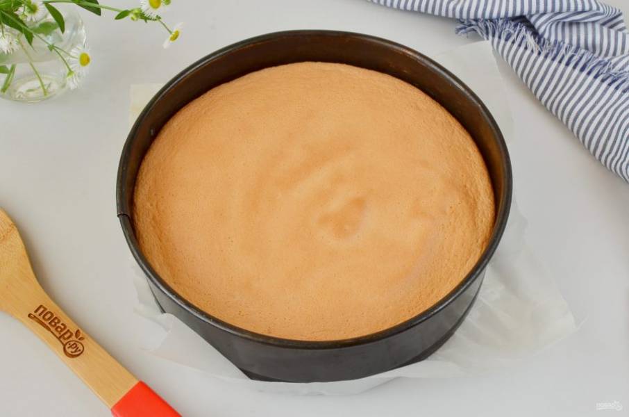 Форму для бисквита проложите пергаментом, перелейте тесто и отправьте в духовку на 15-20 минут.