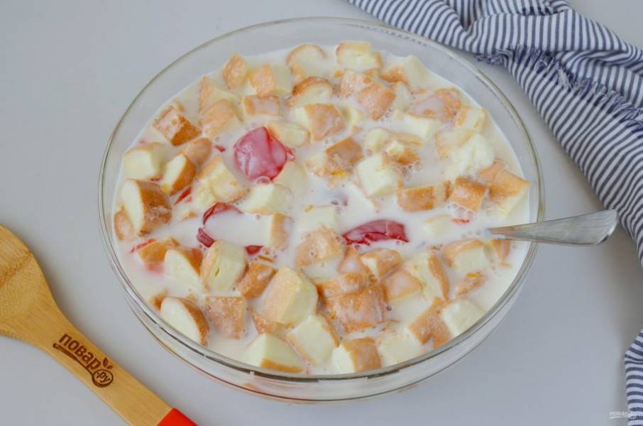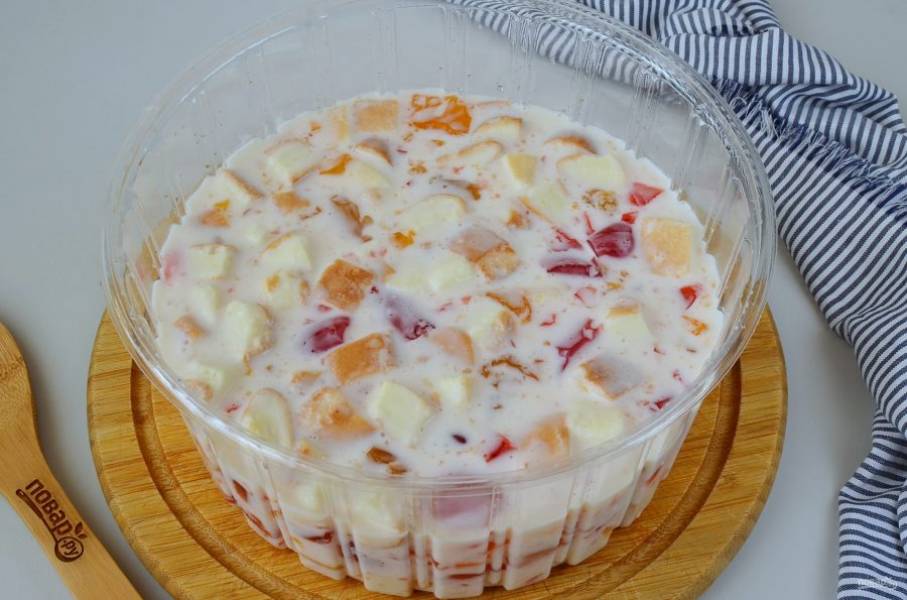В сметанный крем добавьте кубики бисквита. Все хорошо перемешайте.