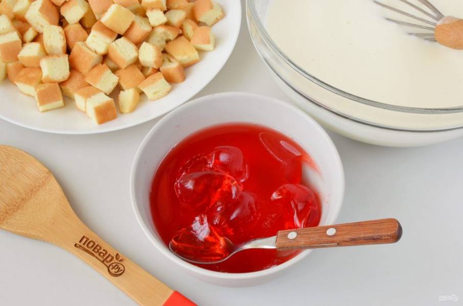 Пока желатин настаивается, порежьте холодный бисквит кубиками.
