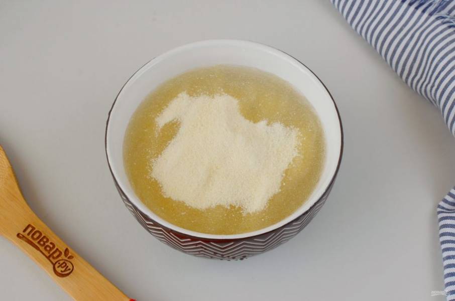 Замочите 40 грамм желатина в 300 мл. холодной воды, дайте постоять.