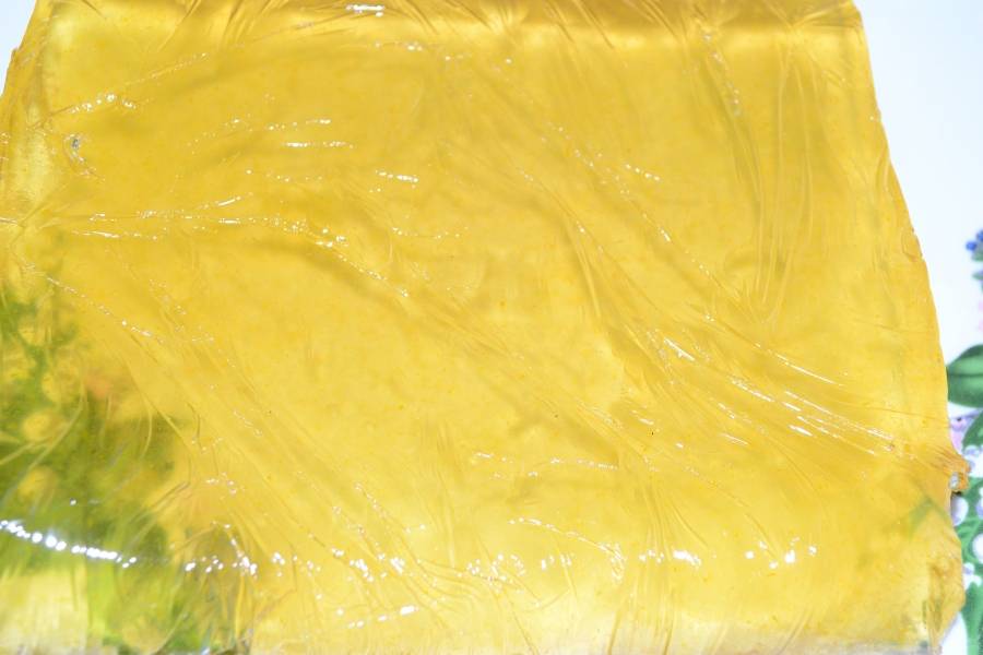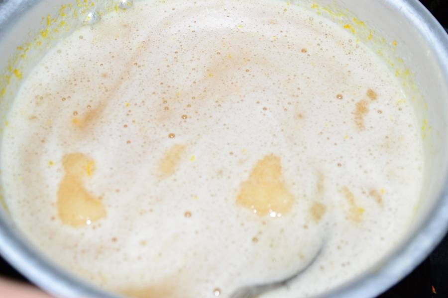Когда сахар растворится, снять кастрюлю с огня и добавить набухший желатин. Тщательно перемешать, чтобы все комочки растворились. Процедить через сито цедру.