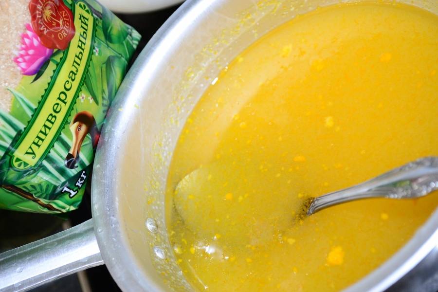 В кастрюльку насыпать два стакана сахара и залить его водой. Добавить цедру апельсина и лимона. Поставить кастрюльку на огонь, постоянно помешивать, пока сахар не растворится.