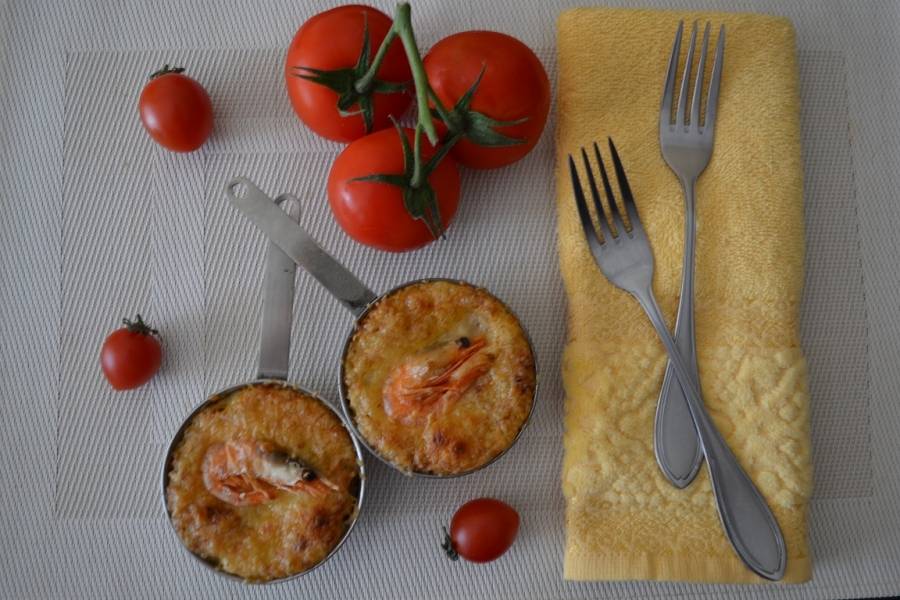 Выкладываем морепродукты в кокотницу, сверху посыпаем мелко натертым сыром и в качестве украшения в серединку кладем одну неочищенную креветочку. Запекаем в духовке в течении 10 минут на режиме "средний гриль"