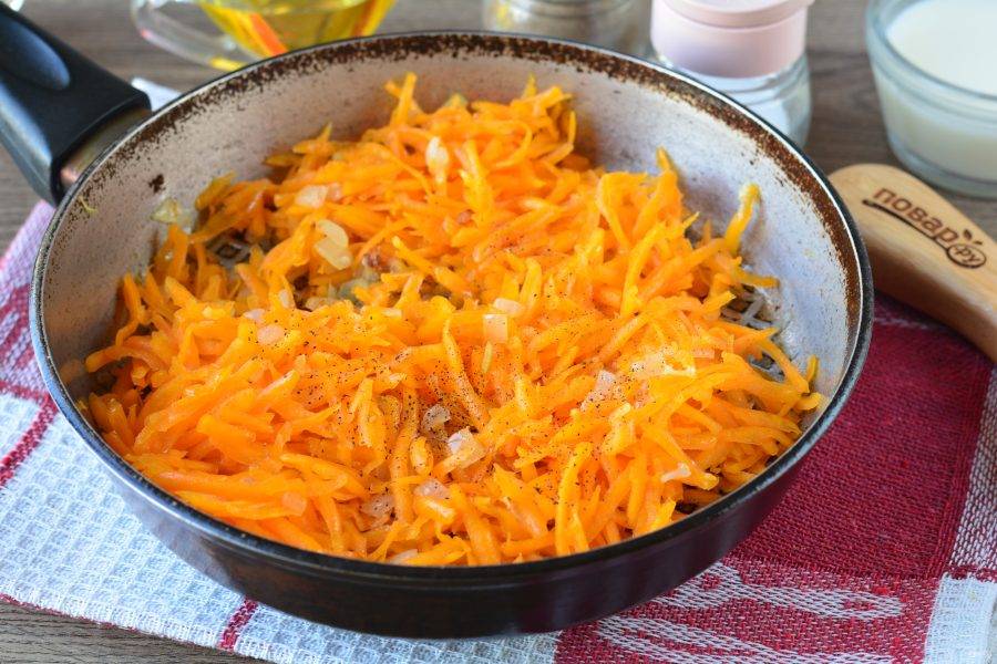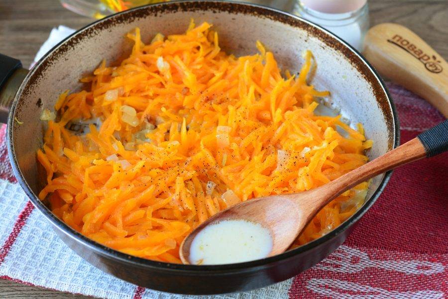 Всыпьте натертую тыкву в сковороду, добавьте соль, черный перец по вкусу. Обжаривайте тыкву пару минут, помешивая.