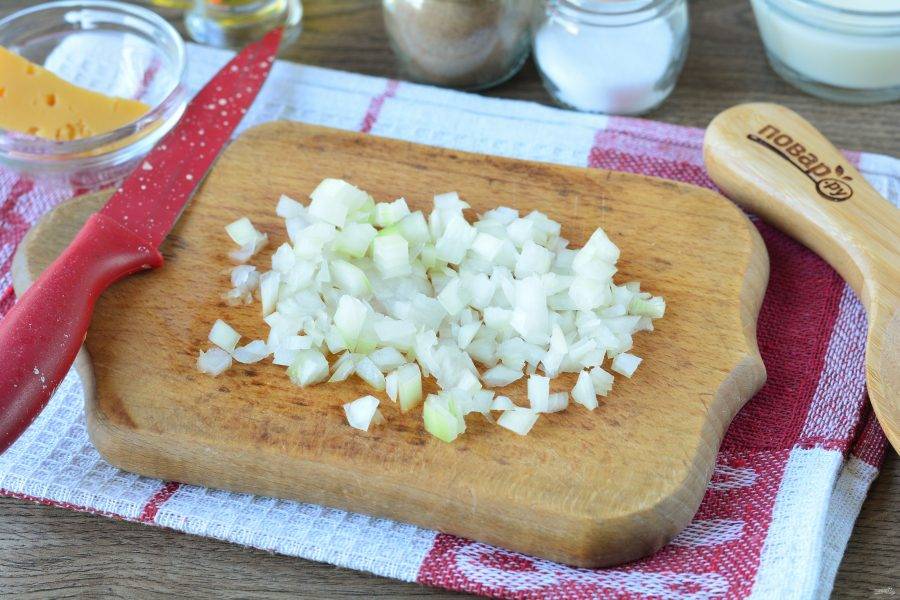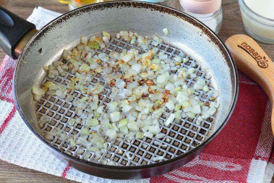 Обжаривайте лук в сковороде с растительным маслом. Готовьте до появления золотистого оттенка.