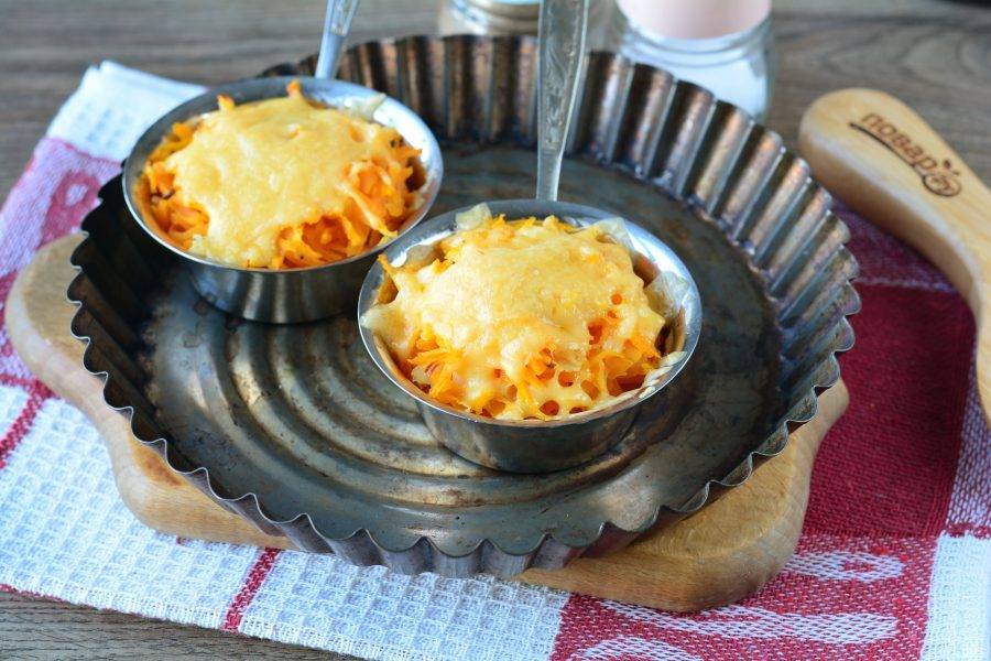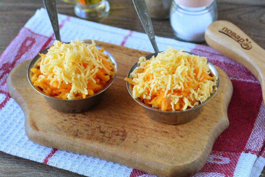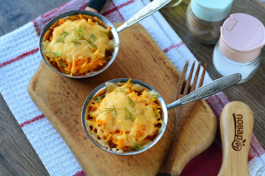 Переложите тыкву в кокотницы для запекания жульена или керамические рамекины, что у вас есть. Присыпьте тыкву тертым сыром и отправьте в разогретую духовку.