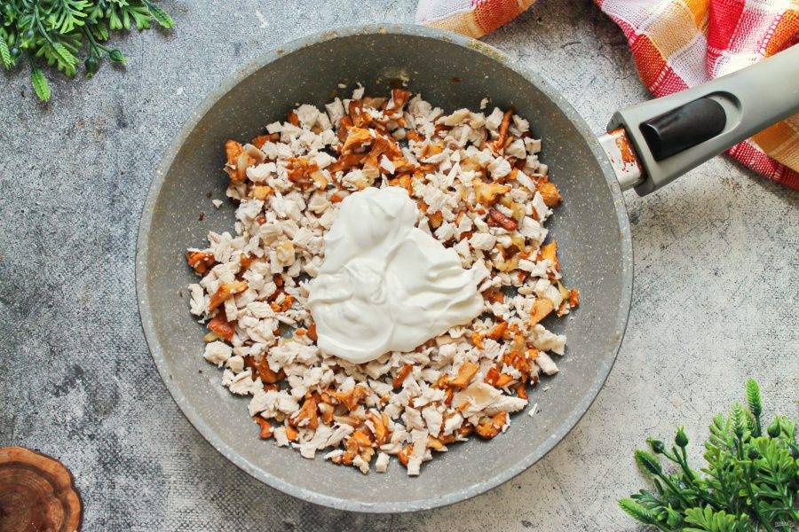 Выложите в сковороду сметану, перемешайте, снимите с огня.