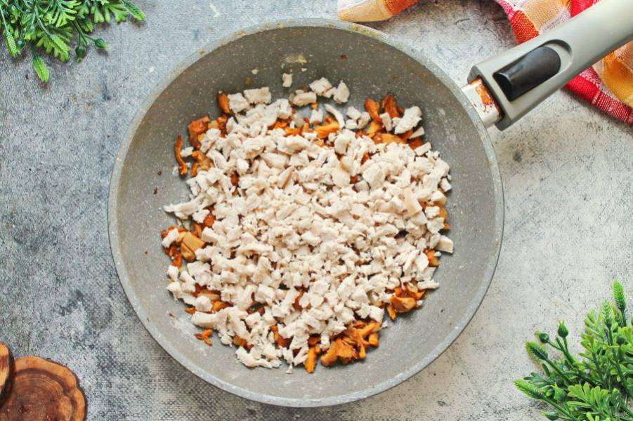 Курицу мелко порежьте и добавьте в сковороду, перемешайте и обжарьте в течение 1-2 минут.