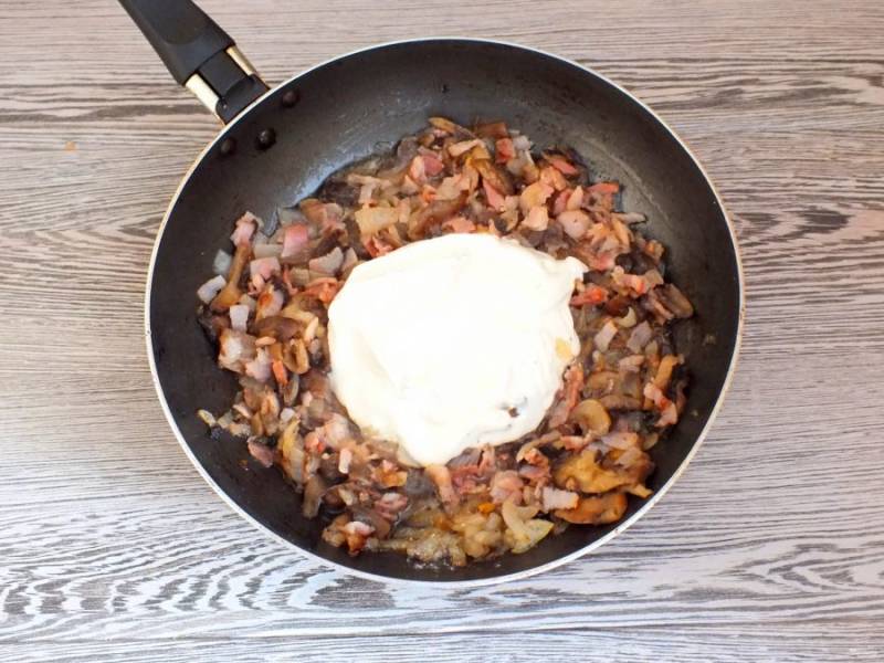 В завершении, начинку посолите, добавьте перец, введите сметану. Перемешайте.