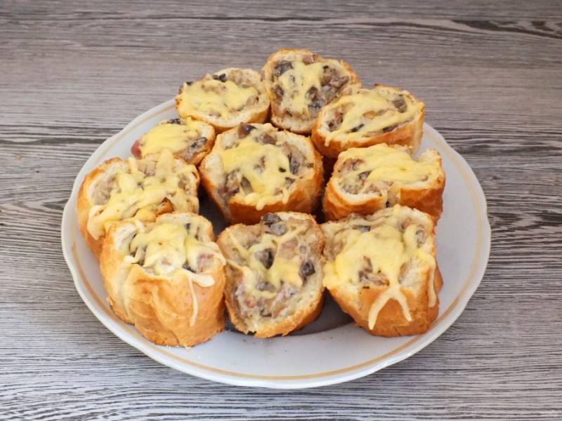 Включите духовку на 200 градусов. Возьмите противень, смажьте тонким слоем растительного масла, присыпьте манной крупой. Выложите заготовки из багета и заполните грибной начинкой. Сверху разложите тертый твердый сыр. Поставьте в духовку на 5-7 минут, пока не расплавится сыр.