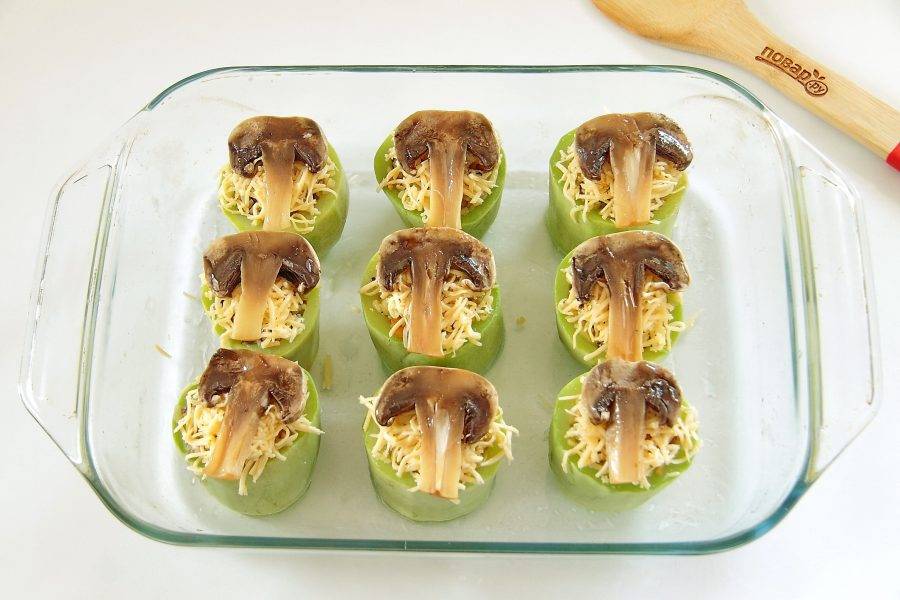 Форму смажьте маслом. В стаканчики из кабачков разложите готовую начинку.