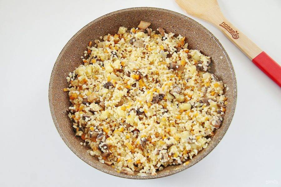 Добавьте булгур, соль, перец по вкусу, перемешайте и потушите начинку около 5 минут.
