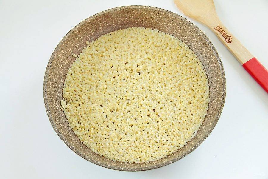 Обжарьте булгур на небольшом количестве растительного масла, около 10 минут. Затем добавьте воду, соль и на небольшом огне под крышкой готовьте до полного впитывания жидкости.