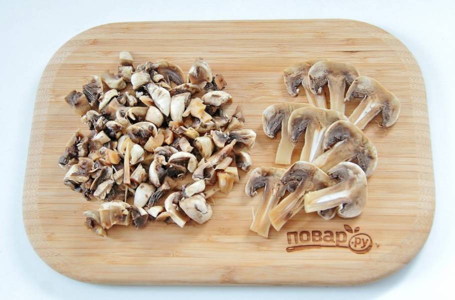 Для начинки разрежьте шампиньоны пополам, из средней части нарежьте 9 пластин, а остальные грибы нарежьте кубиками.