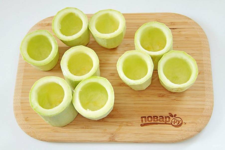 Кабачки вымойте, срежьте кончики, чтобы они приняли ровную поверхность. Каждый разрежьте на три части и маленькой ложечкой выньте мякоть, чтобы получились стаканчики.