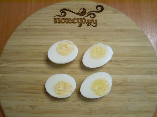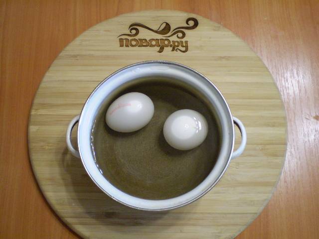 2. Яйца залейте холодной водой и поставьте на огонь. Варите с момента закипания 7-9 минут. Затем обдайте ледяной водой. Очистите от скорлупы.