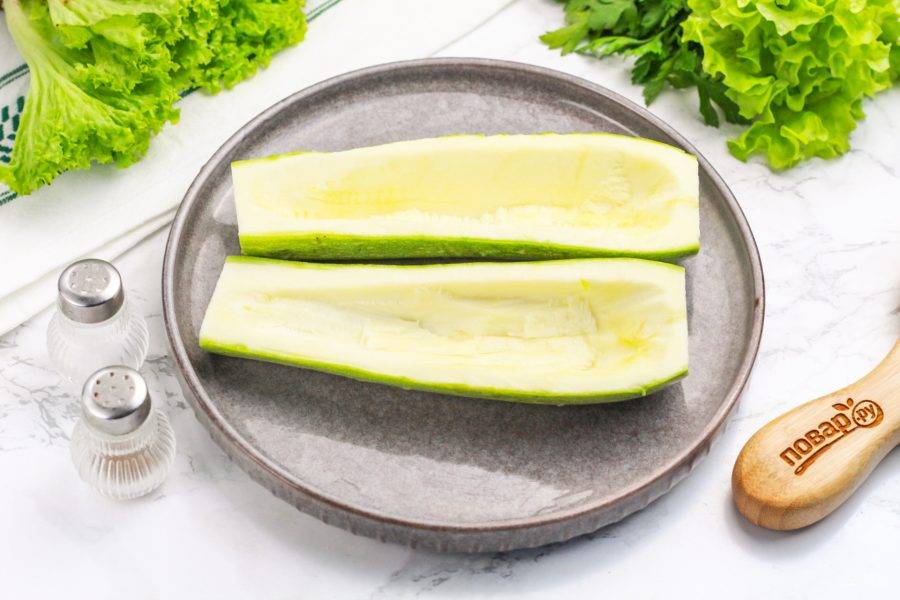 Промойте кабачок или несколько овощей, если вам позволяет емкость аэрогриля. Срежьте хвостики с обеих сторон и разрежьте вертикально пополам. Вырежьте внутри, чтобы получилась полая "лодочка".