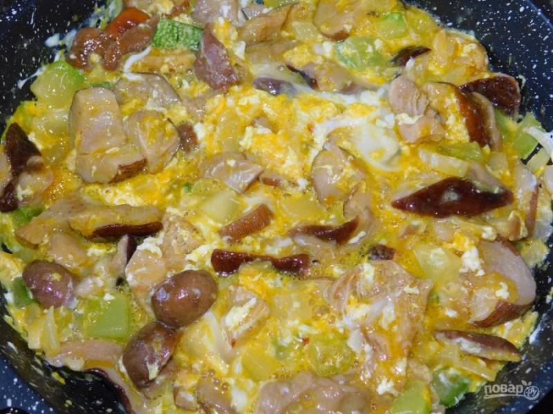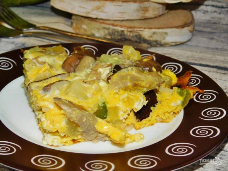 Сейчас такой момент, когда еще не закончились кабачки и уже началась грибная пора. Предлагаю совместить грибы с кабачками и залить это все омлетом. Получается очень вкусно!