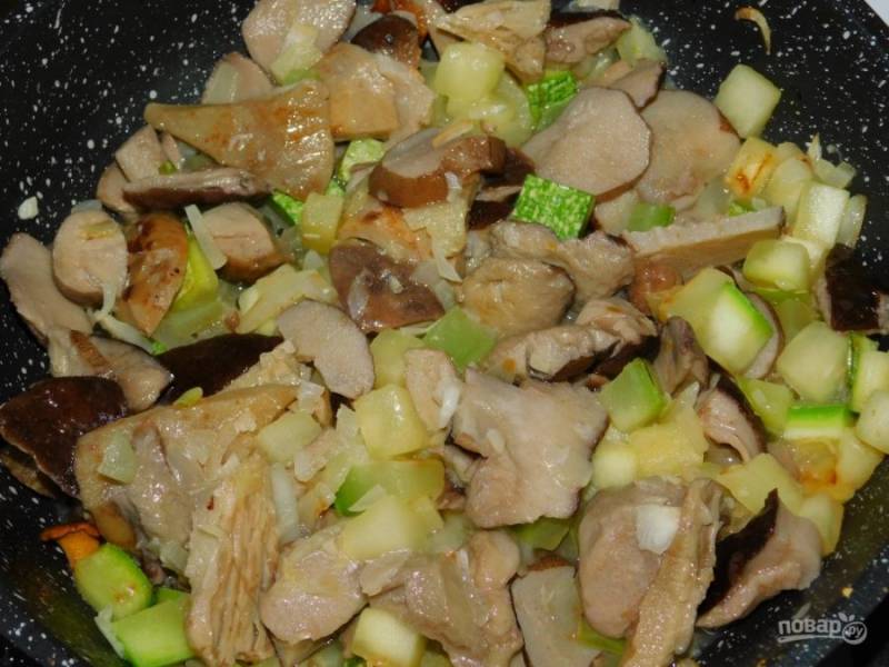 Добавьте лесные грибы, предварительно отваренные. Обжаривайте все вместе минуты 3-4.