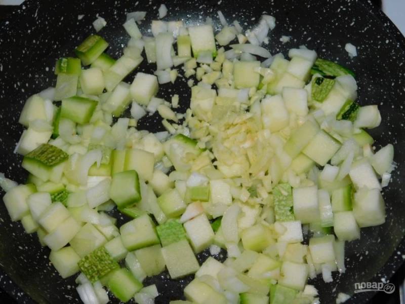 Кабачки нарежьте кубиками, обжарьте с луком и чесноком.