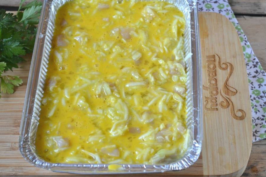 Выложите подготовленную массу в форму для запекания, залейте взбитым яйцом и отправьте в духовку, разогретую до 180 градусов, на 45 минут.