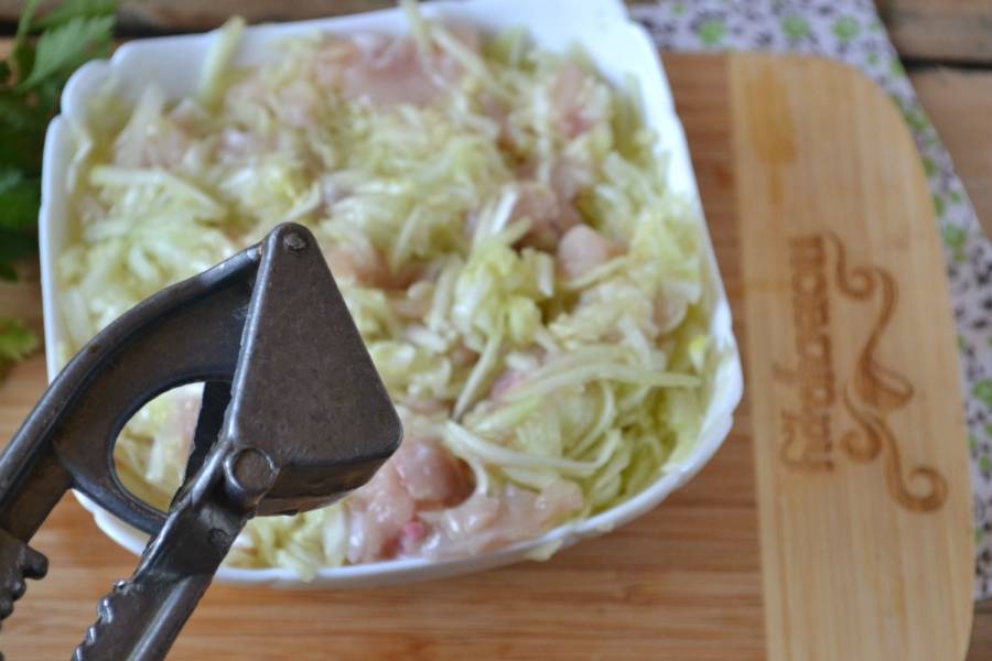 Хорошенько перемешайте курицу с кабачком, посолите, выдавите пару зубчиков чеснока.