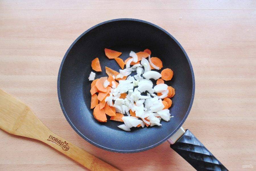 Морковь и репчатый лук очистите, помойте и нарежьте произвольно. Выложите в сковороду или сотейник. Налейте подсолнечное масло и пассеруйте овощи до прозрачности лука в течение 5-6 минут.