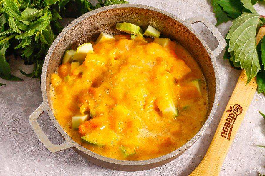 Влейте персиковый сок с мякотью и перемешайте. Поместите емкость на плиту и доведите ее содержимое до кипения. Убавьте нагрев и томите еще 15 минут.