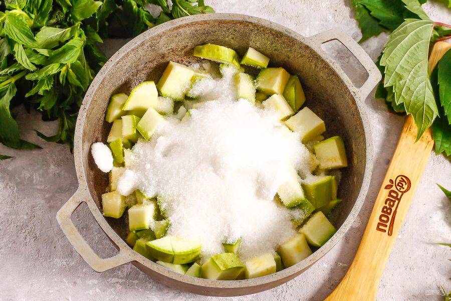 Кабачки промойте в воде, срежьте с овощей хвостики и нарежьте их небольшими кубиками. Помните, что они уварятся в два раза, поэтому слишком мелко не нарезайте. Пересыпьте нарезку в казан или кастрюлю с антипригарным дном.