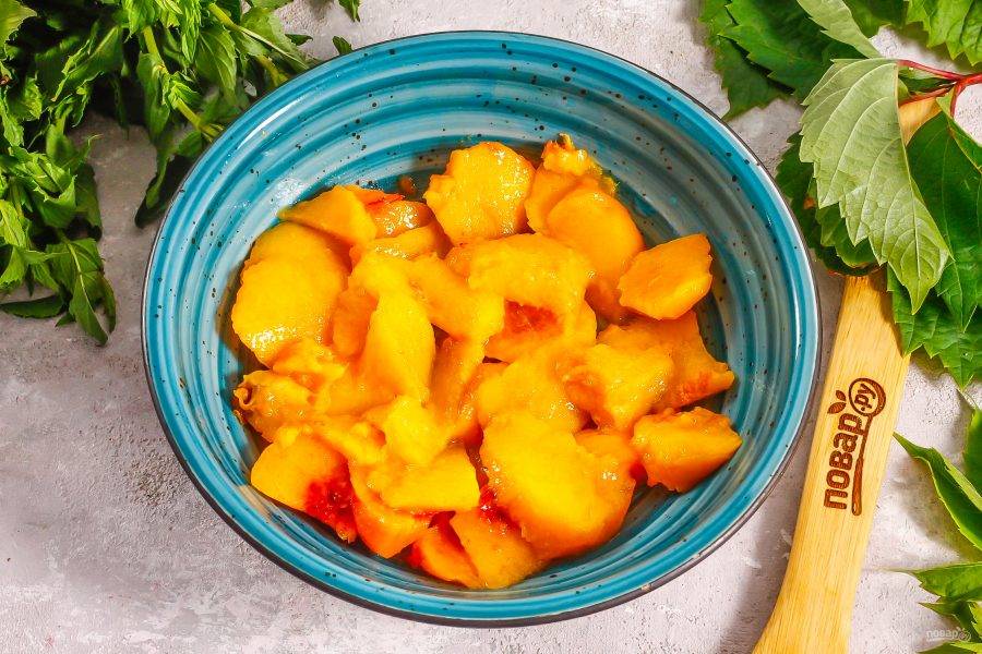 Персики ошпарьте кипятком и счистите с плодов кожуру. Нарежьте мякоть ломтиками.