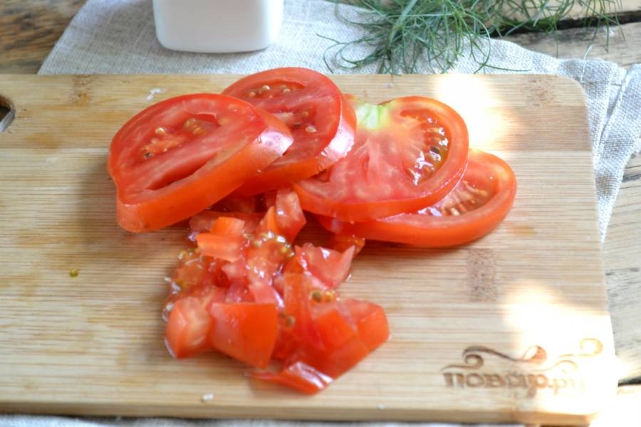 Помидоры нарежьте кружочками, затем тоже измельчите. У вас должны получиться небольшие кубики.