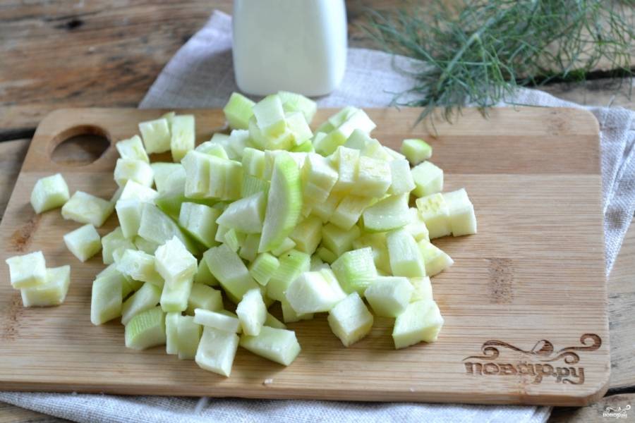 Кабачки нарежьте небольшими кубиками и посолите. Оставьте на 30 минут, чтобы они пустили сок.