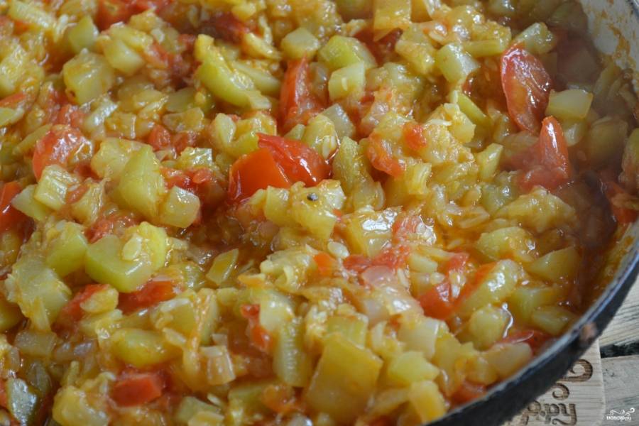 Готовьте икру до тех пор, пока помидоры полностью разварятся и окрасят остальные овощи.