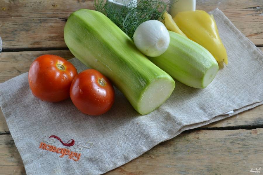 Подготовьте необходимые ингредиенты. Все овощи хорошенько промойте, дайте стечь воде. Перец разрежьте на четвертушки, удалите семена и плодоножки. Лук и кабачки очистите от кожуры.