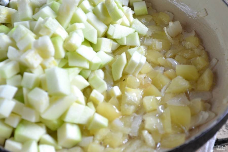 Теперь подошла очередь кабачков. Слегка отожмите порезанные кабачки от образовавшегося сока, отправьте их на сковородку. Тушите под крышкой, пока кабачки станут мягкими. Это займет примерно минут 20.